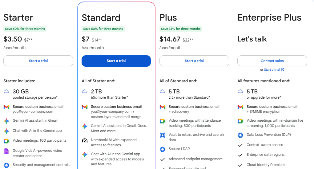Larger teams or enterprises can opt for the Enterprise plan, which comes with unlimited storage and premium features like S/MIME email encryption and real-time streaming in Google Meet.