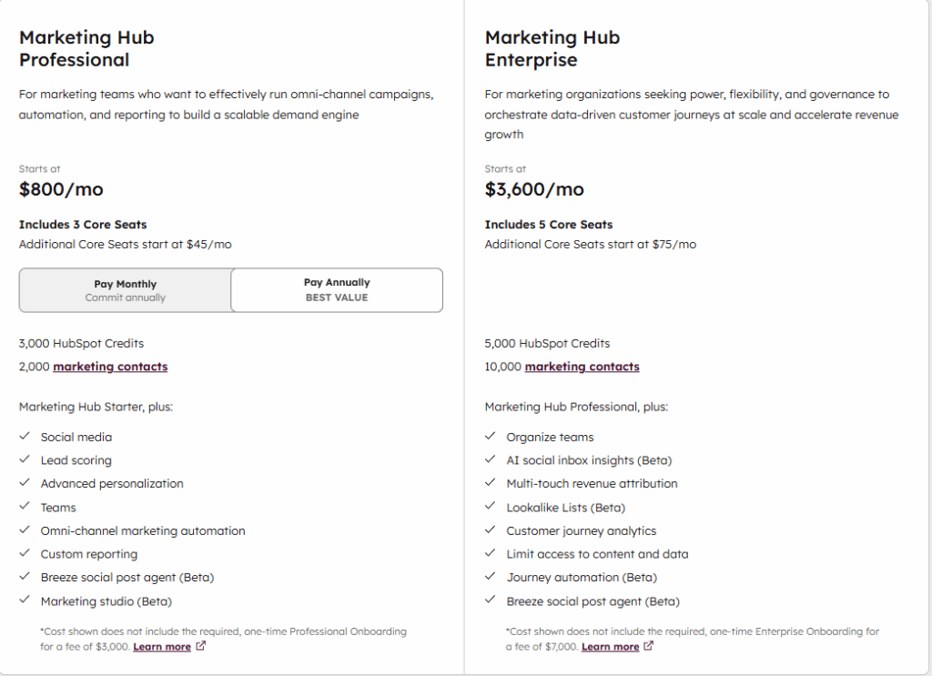 HubSpot offers flexible pricing for their Marketing Hub, making it accessible to businesses of all sizes. Whether you’re just getting started with their Professional plan or looking for Enterprise features, you can find a plan that suits your needs.
