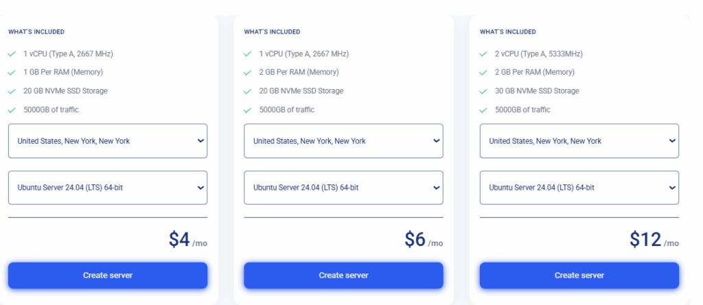 - (1 vCPU, 1GB RAM, 20GB SSD) – Only $4/month