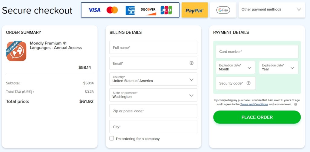Ensure that your preferred payment method is accepted during checkout. Mondly typically accepts credit cards, PayPal, and sometimes even more localized payment methods depending on your region. Make sure to confirm the available payment options before completing the purchase.