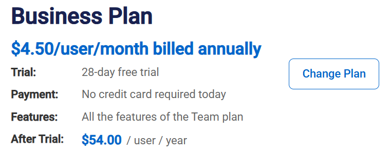 Perfect for small teams up to 20 members, with secure password storage and sharing features. - Business Plan: Just $4.50 per user/month (billed annually) –