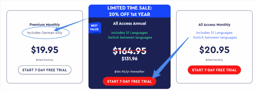 • Typically, the All Access Monthly plan includes 51 languages, allowing users to switch between languages for the same monthly price.