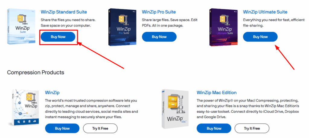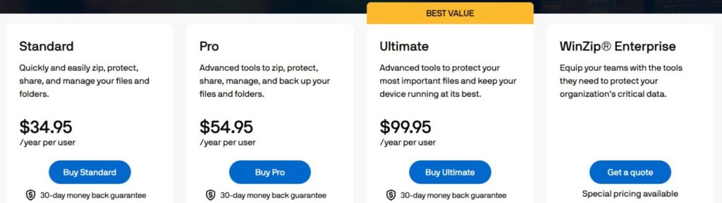 Winzip offers a range of plans from Standard for individuals to Enterprise for larger teams.